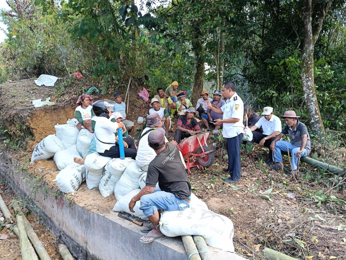 Ia menjelaskan ada beberapa item pekerjaan yang dilakukan masyarakat, diantaranya: Pemasangan talang untuk pengairan longsor sepanjang 25 m, tinggi 10 m dan lebar 10 m.Pemasangan tanggul dengan menyusun karung yang telah diisi tanah, dan pemasangan bambu untuk penyangga talang.(spr)