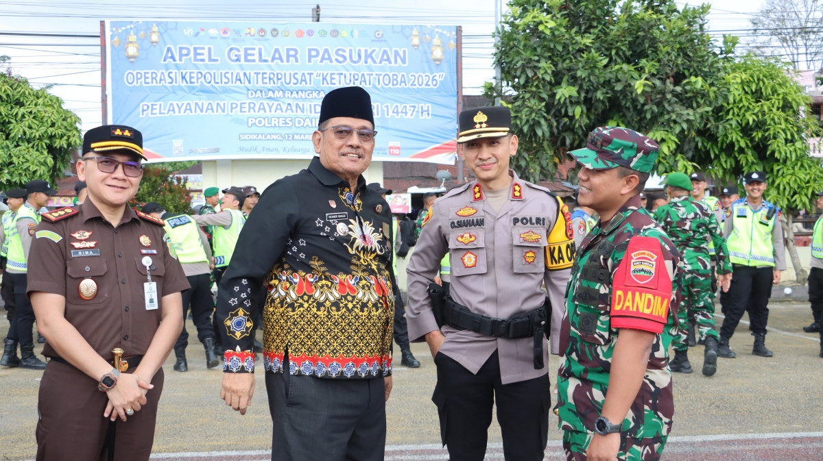 DAIRI – Menjelang perayaan Idulfitri, Pemerintah Kabupaten Dairi bersama aparat keamanan memperkuat kesiapan pengamanan arus mudik dan perayaan Lebaran Tahun 2026. Hal ini terlihat dalam kegiatan Apel Gelar Pasukan Operasi Ketupat Toba 2026 yang dihadiri oleh Bupati Dairi, Vickner Sinaga bersama unsur Forkopimda di Lapangan Mapolres Dairi, Kamis (12/3/2026).