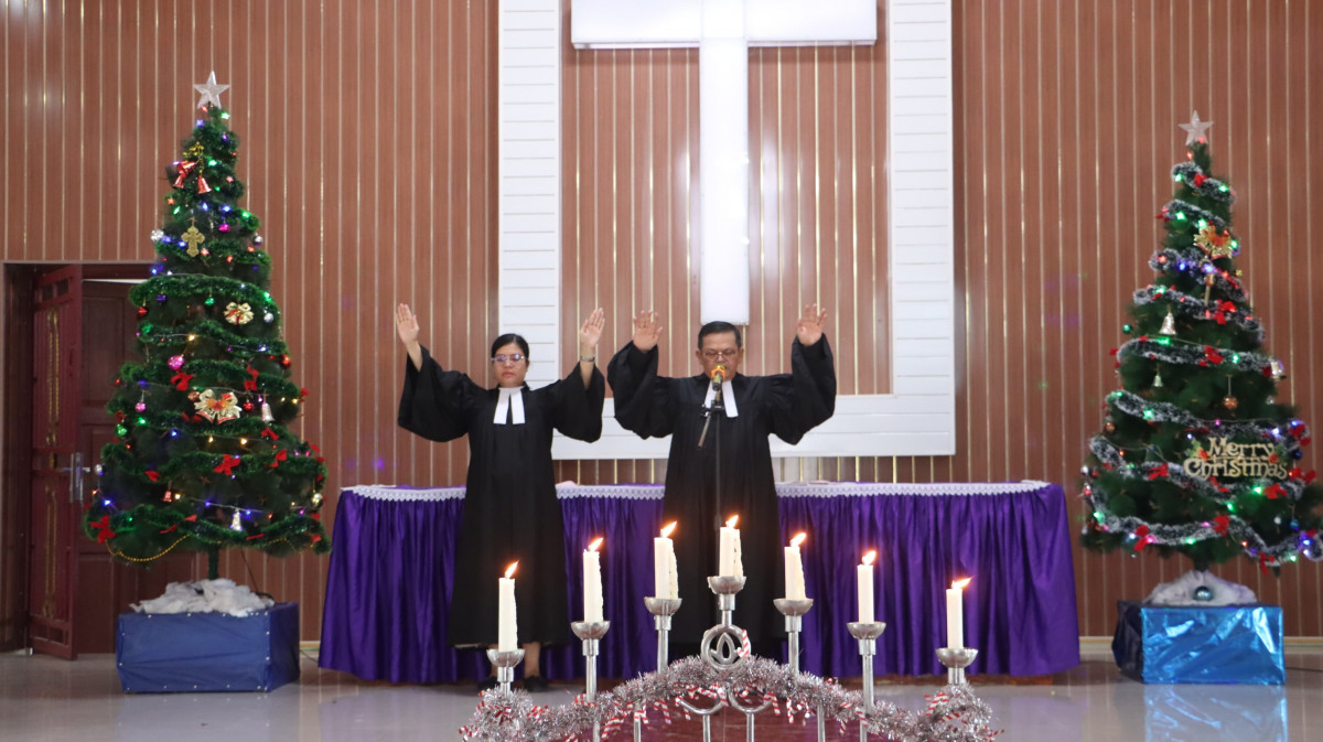 "Dengan tema hari ini Allah hadir menyelamatkan keluarga, bagaimana kita bisa merasakan lawatan Tuhan jika kita berkenan menghadirkan Tuhan dalam keluarga. Bagaimana kita bisa menghadirkan secara pribadi. Pesan natal hari ini, mari kita saling menopang, saling menolong ditengah keterbatasan kita. Allah hadir memberikan kepastian, keselamatan, kesehatan jasmani dan rohani," kata pendeta dalam khotbahnya.