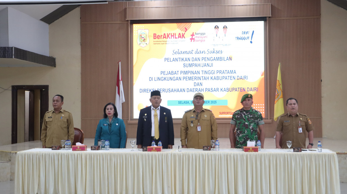 Sidikalang - Bupati Dairi Vickner Sinaga melantik Pejabat Pimpinan Tinggi Pratama dan Direksi Perusahaan Daerah Pasar Kabupaten Dairi periode 2026-2030, Selasa (30/12/2025) di Balai Budaya Sidikalang. Pelantikan tersebut di hadiri oleh Wakil Bupati Dairi Wahyu Daniel Sagala, Sekretaris Daerah Surung Charles Bantjin.