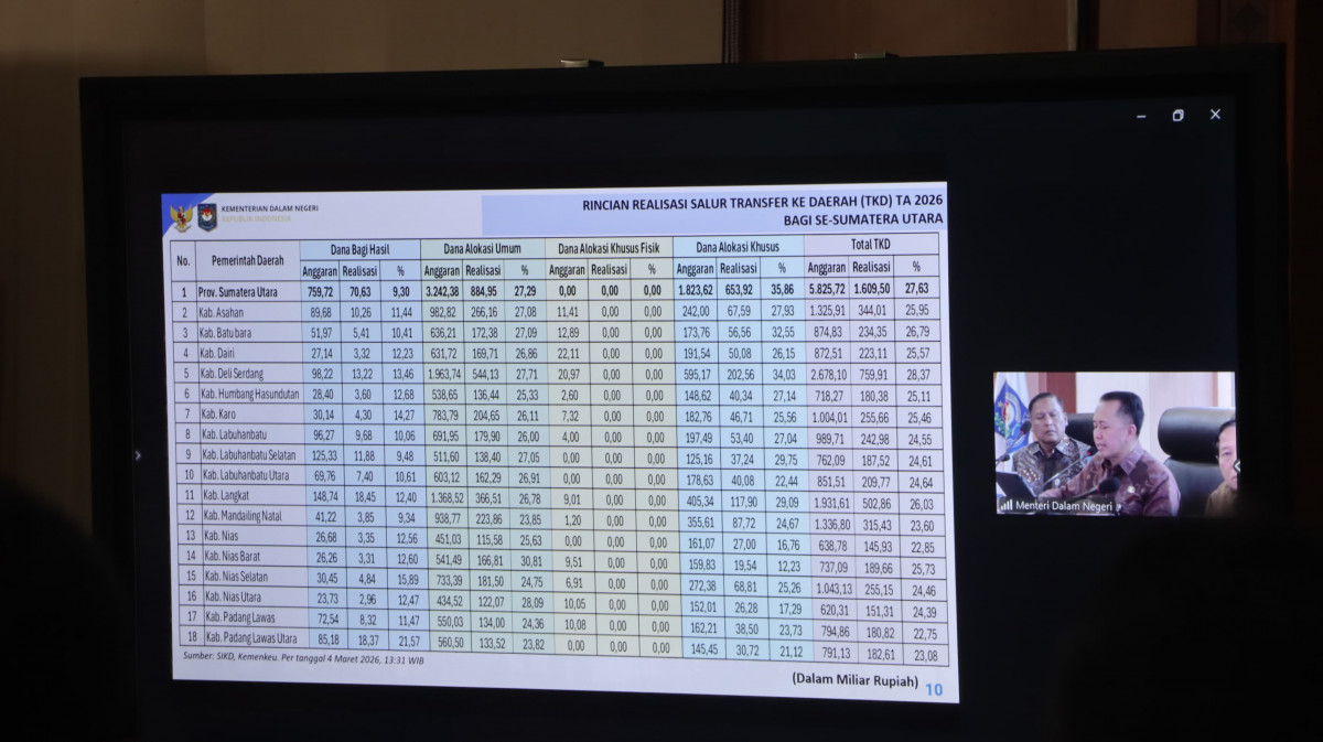 Dalam paparannya, Menteri Dalam Negeri menyampaikan penyesuaian alokasi TKD dilakukan berdasarkan Keputusan Menteri Keuangan (KMK) Nomor 59 Tahun 2026 yang mengatur penyesuaian rincian alokasi dan penyaluran Dana Bagi Hasil (DBH), Dana Alokasi Umum (DAU) serta Dana Otonomi Khusus bagi daerah tertentu yang terdampak bencana.