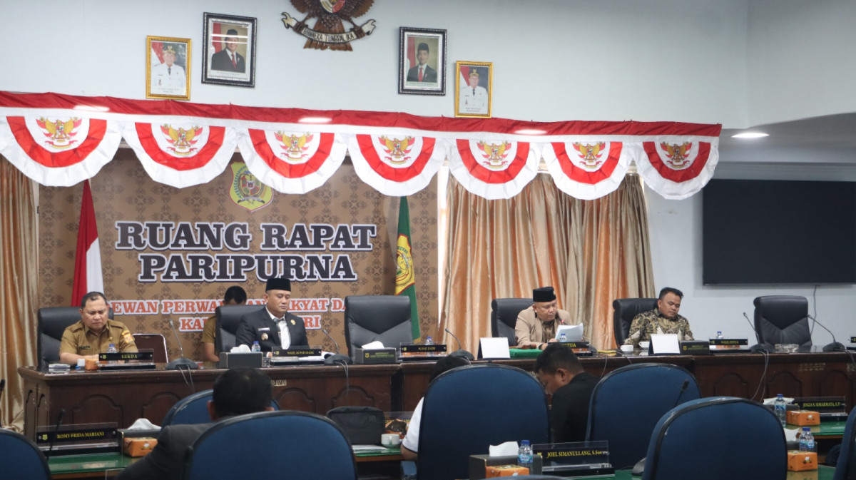 Dairi – Bupati Dairi Vickner Sinaga yang diwakili oleh Wakil Bupati Dairi Wahyu Daniel Sagala menyampaikan Nota Pengantar Keuangan Bupati Dairi atas Rancangan Peraturan Daerah (Ranperda) Kabupaten Dairi tentang Perubahan Anggaran Pendapatan dan Belanja Daerah (PAPBD) Tahun Anggaran 2025 pada Senin (29/9/2025) dalam sidang paripurna DPRD Dairi. Sidang paripurna dipimpin oleh Ketua DPRD Dairi Sabam Sibarani yang didampingi oleh Wakil Ketua DPRD Dairi Halvensius Todang.