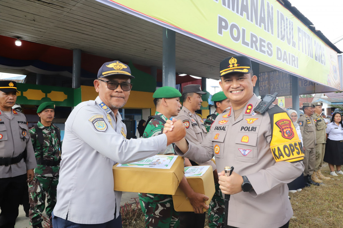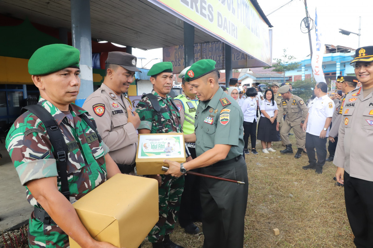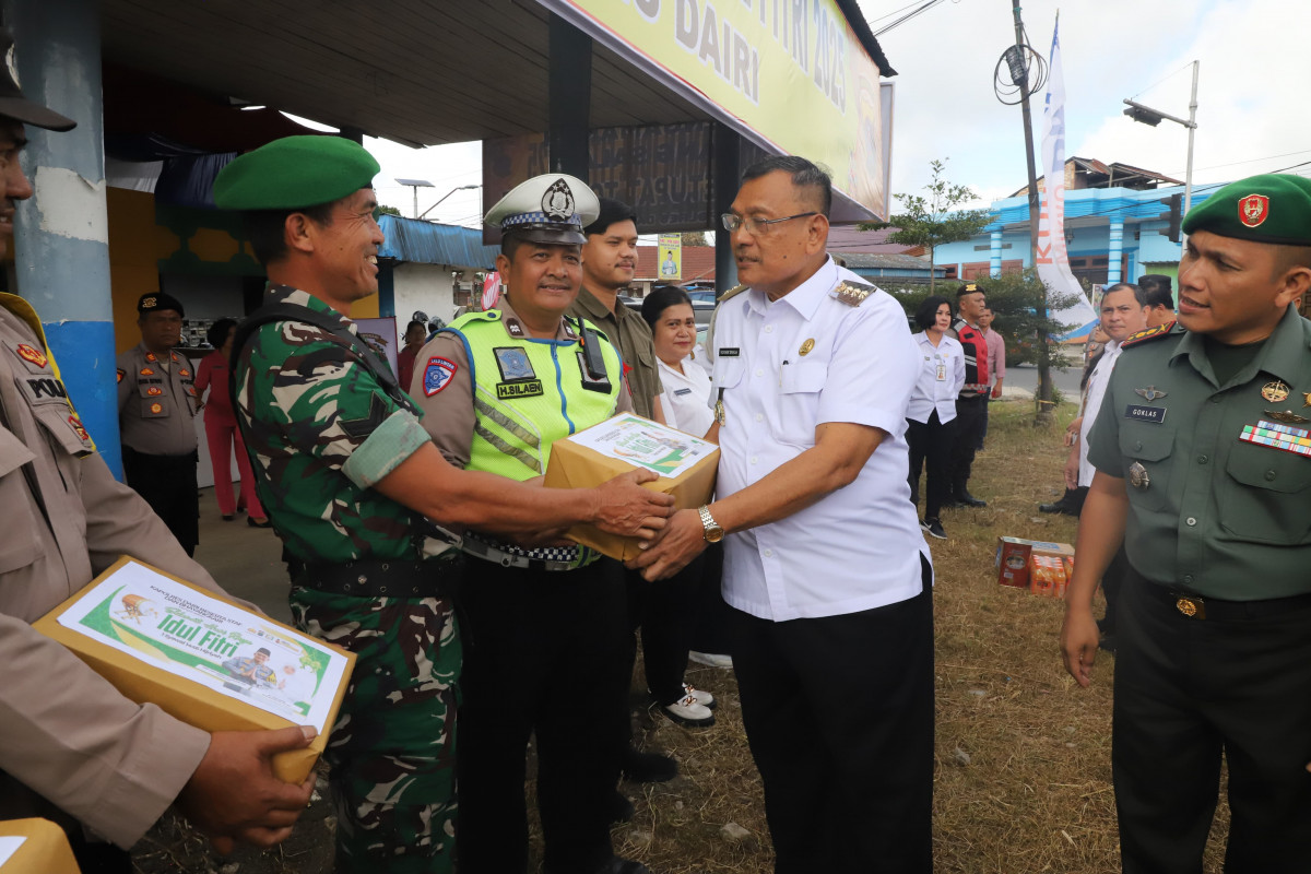 Untuk menyemangati, Bupati Dairi juga menyerahkan bingkisan Idul Fitri kepada petugas pengamanan.