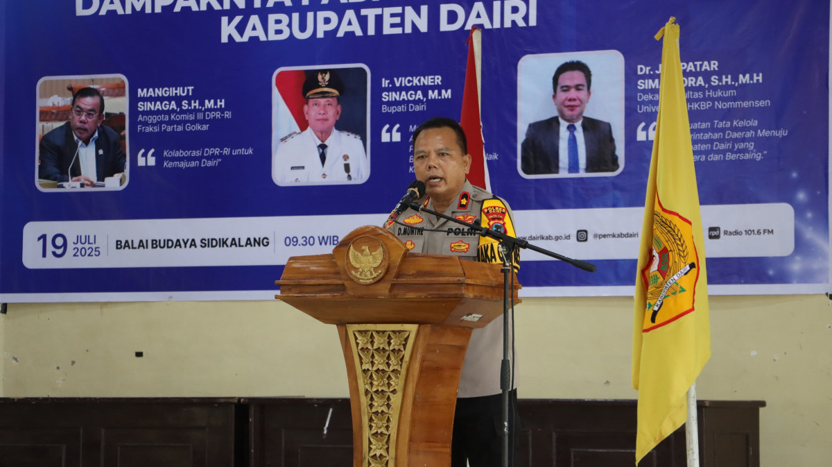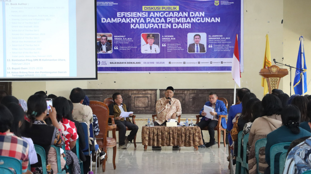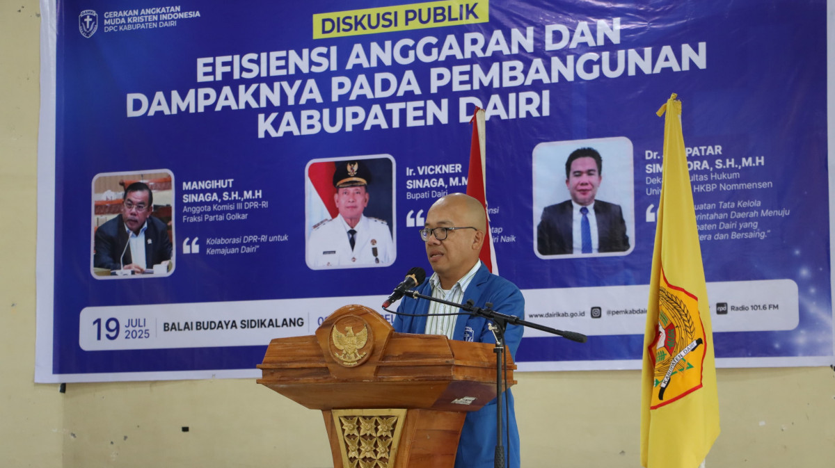 Dairi- Bupati Dairi Vickner Sinaga menjadi pembicara pada Diskusi Publik yang digelar oleh DPC Gerakan Angkatan Muda Kristen Indonesia (GAMKI) Kabupaten Dairi. Diskusi publik bertema 'Efisiensi Anggaran dan Manfaatnya Bagi Kabupaten Dairi, juga menghadirkan pembicara lain, yakni Anggota DPR RI, Komisi III, Mangihut Sinaga, Dekan Fakultas Hukum Universitas Nomensen, Janpatar Simamora dengan moderator Redy Antonius Nababan.
