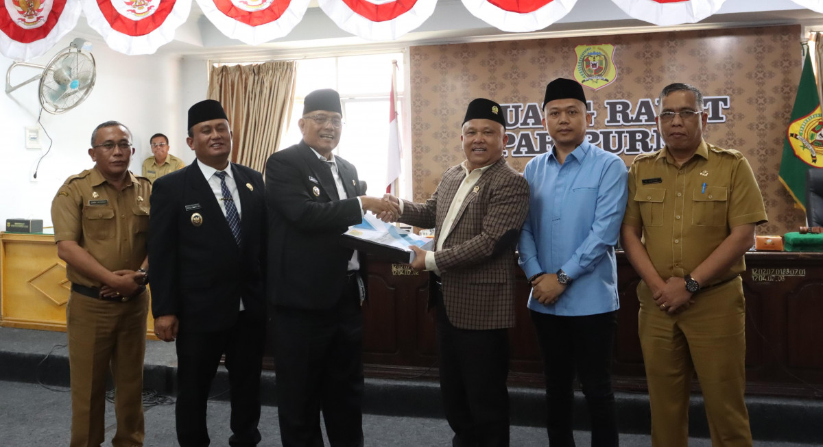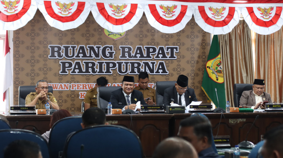 Sidikalang - Bupati Dairi Vickner Sinaga di dampingi oleh Wakil Bupati Dairi Wahyu Daniel Sagala menghadiri sidang paripurna DPRD Dairi pada Selasa (5/8/2025)dengan agenda Penyampaian Nota Pengantar Bupati Dairi atas Ranperda Kabupaten Dairi tentang RPJMD tahun 2025-2029. Sidang paripurna yang diadakan di ruang rapat di pimpin oleh Ketua DPRD Dairi Sabam Sibarani di dampingi oleh Wakil Ketua DPRD Dairi Wanseptember Situmorang.