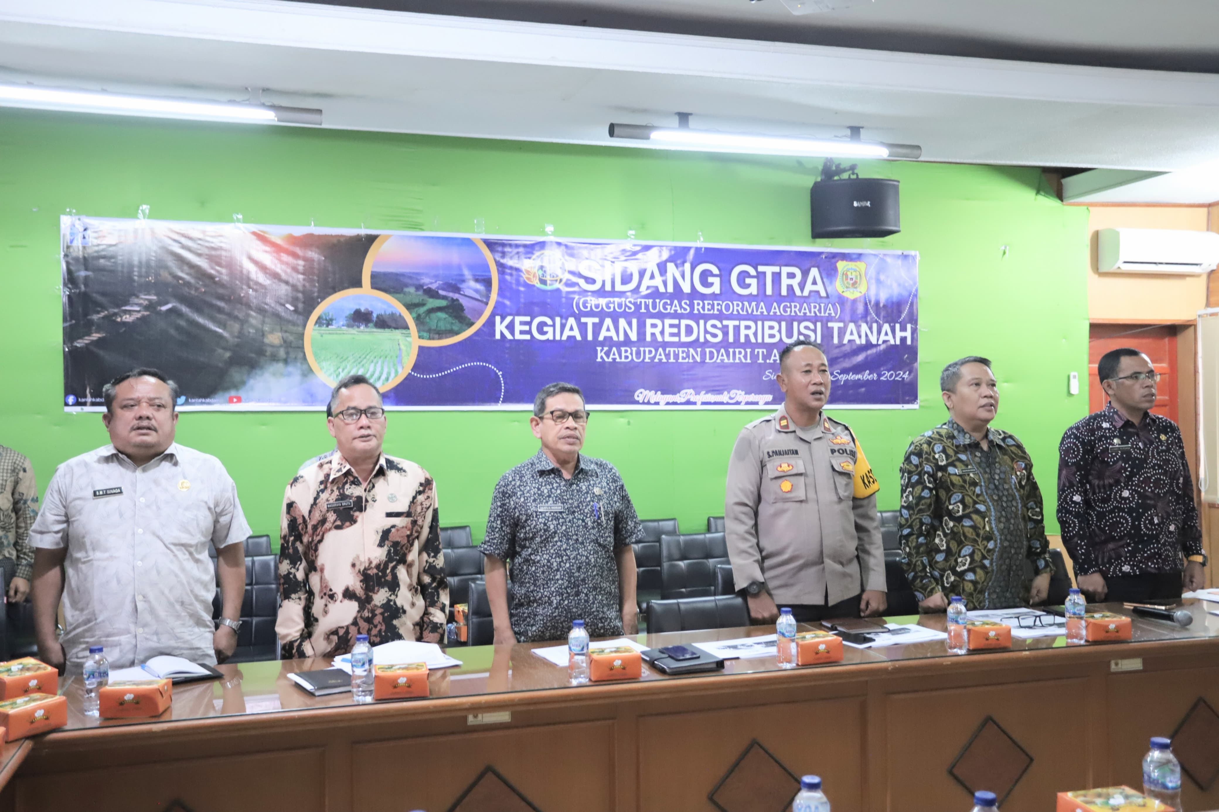 DAIRIKAB.go.id - Penjabat (Pj) Bupati Dairi Surung Charles Bantjin didampingi Penjabat Sekretaris Daerah Jonny Hutasoit, dan Plh Asisten perekonomian dan pembangunan Juliawan Rajagukguk memimpin kegiatan sidang Gugus Tugas Reforma Agraria (GTRA) di ruang rapat Bupati, Kamis (19/9/2024).