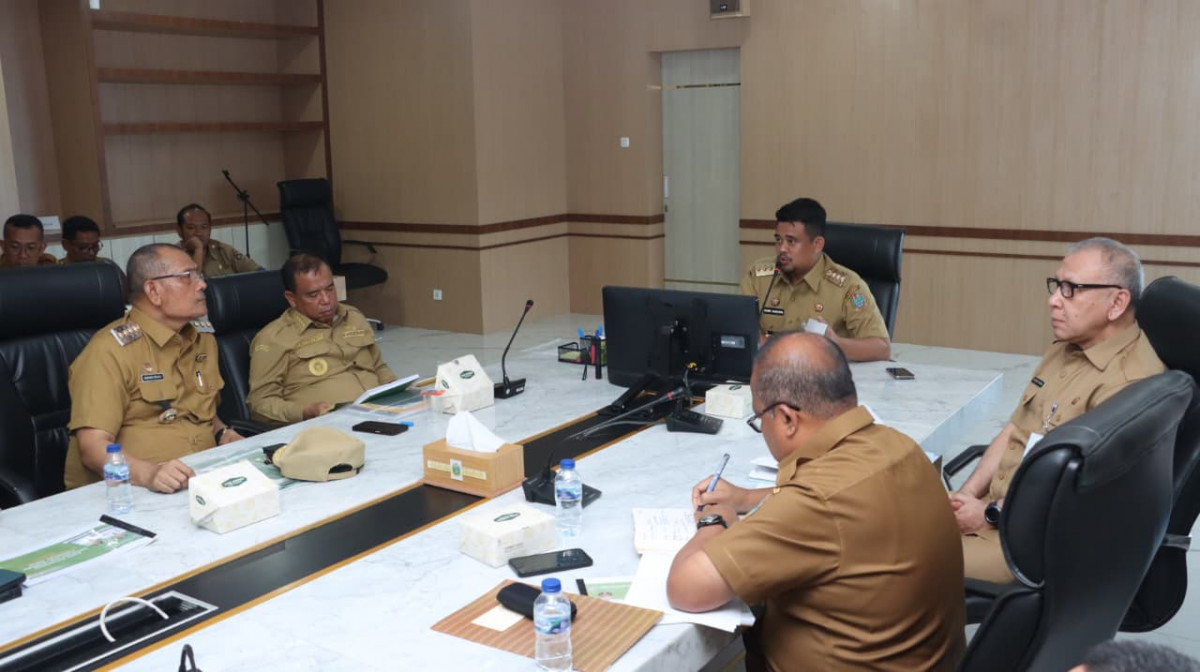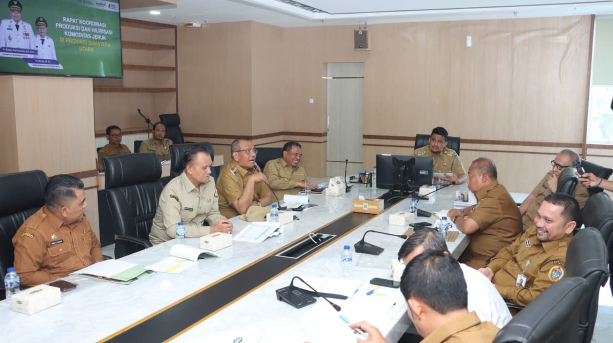 Medan - Bupati Dairi Vickner Sinaga hadiri rapat koordinasi produksi dan hilirisasi komoditas jeruk yang diadakan di Ruang Rapat I Lantai II Kantor Gubernur Sumatera Utara, Senin (25/8/2025). Pertemuan ini sebagai tindak lanjut dari pertemuan pertama yang telah diadakan sebelumnya pada bulan Mei 2025. Rapat koordinasi dihadiri langsung oleh Gubernur Sumatera Utara Bobby Nasution yang di dampingi oleh jajaran Pemerintah Provinsi Sumatera Utara.