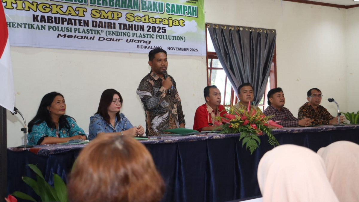 DAIRI - Sebanyak 25 sekolah tingkat SMP sederajat se-Dairi mengikuti lomba kreasi bahan baku sampah yang diadakan oleh Pemerintah Kabupaten Dairi melalui Dinas Lingkungan Hidup pada Kamis (6/11/2025) di Hotel Beristera Sitinjo. Lomba yang mengambil tema 'Hentikan Polusi Plastik Melalui Daur Ulang", dibuka oleh Kepala Dinas Lingkungan Hidup Oloan Hasugian yang diwakili oleh Sekretaris Rikson Panggabean diisi dengan berbagai kegiatan seperti melukis poster dan membuat karya. Turut hadir dalam acara lomba jajaran Dinas Lingkungan Hidup serta para dewan juri