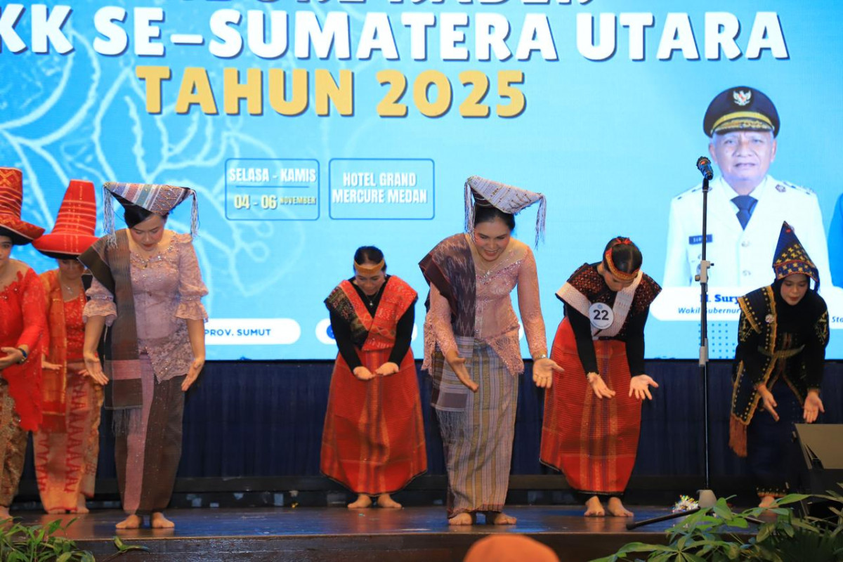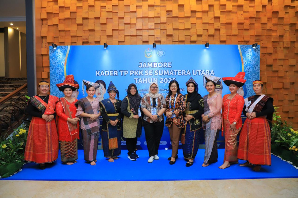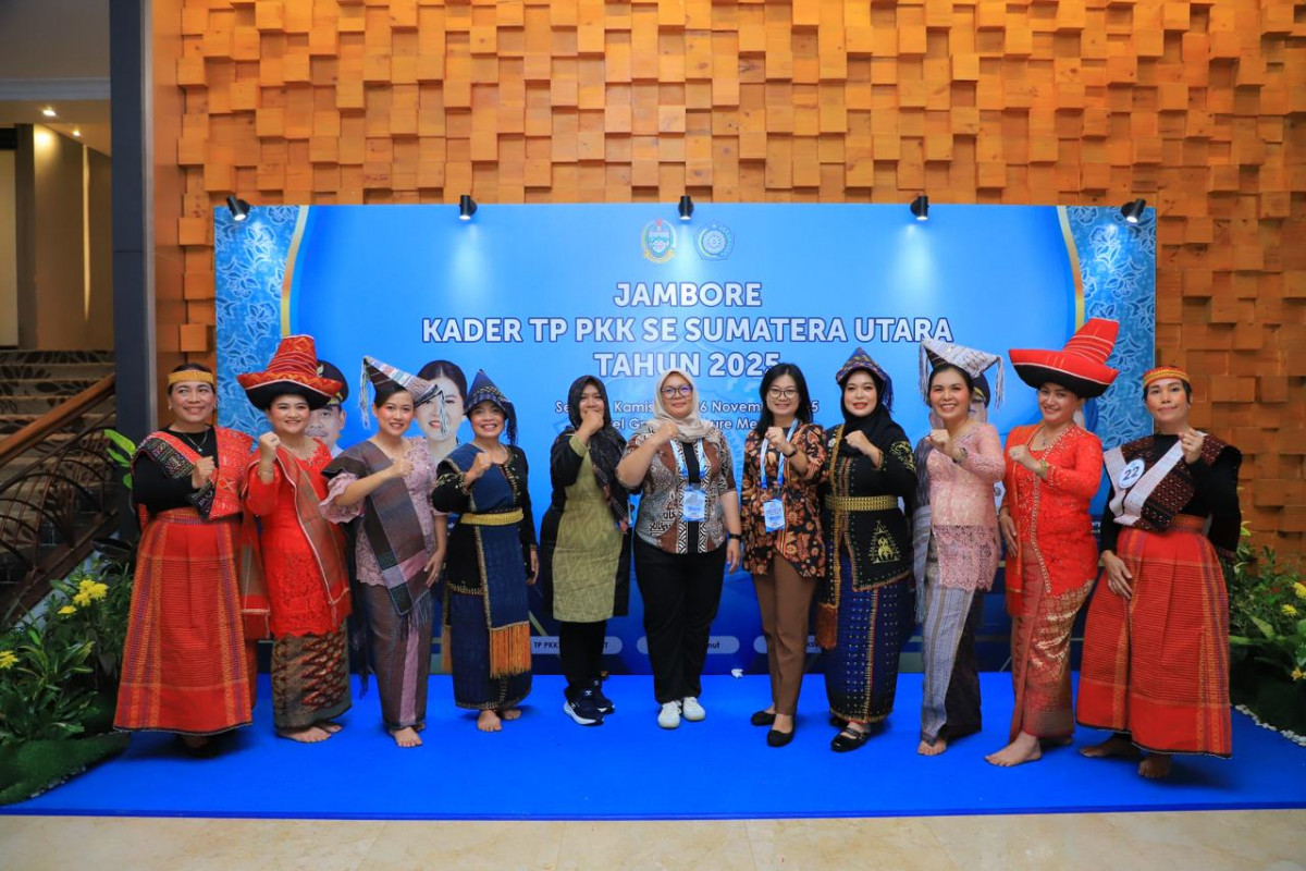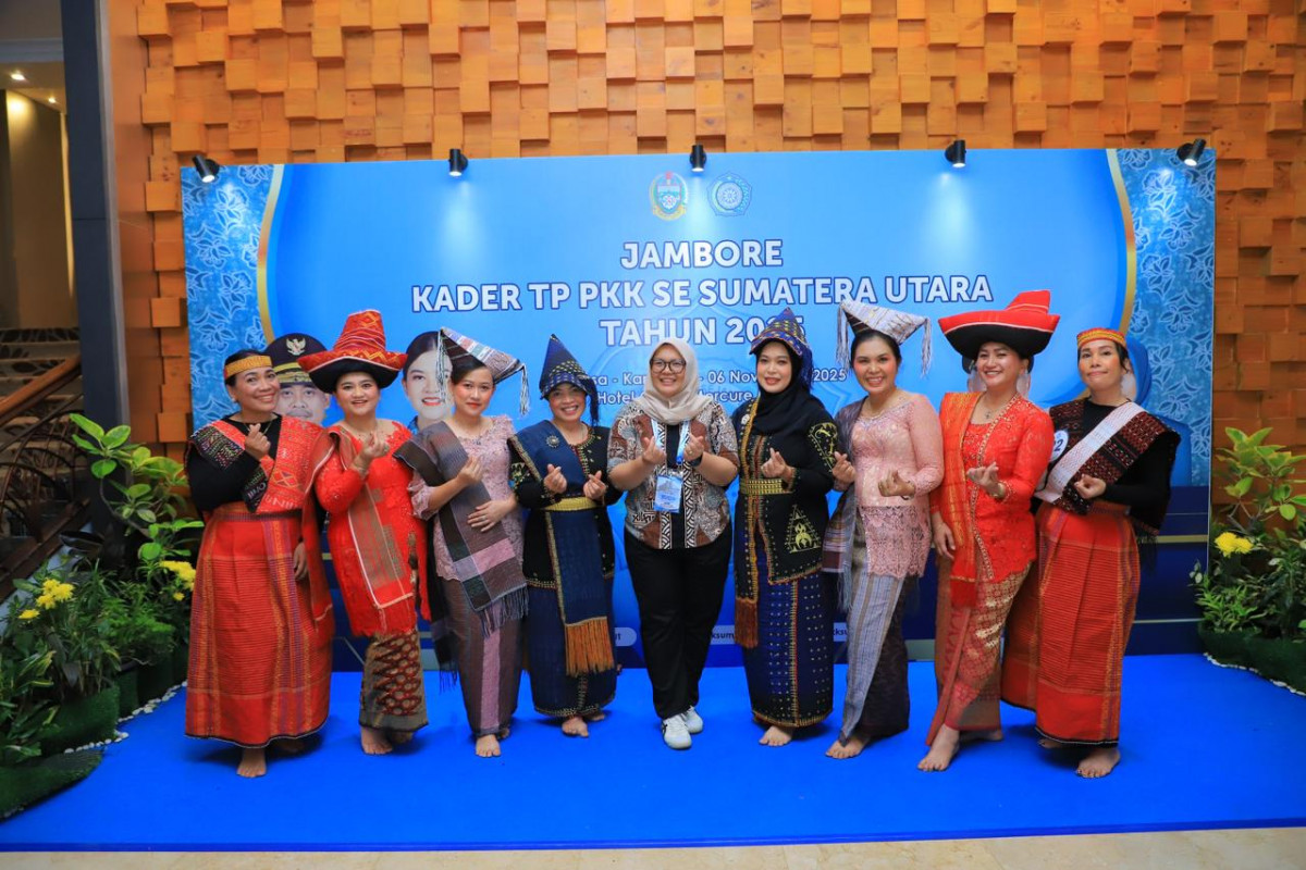 MEDAN - Staff Ahli TP PKK Kabupaten, Ny Sri Dewi Wahyu Sagala bersama sejumlah pengurus PKK Kabupaten Dairi mengikuti Jambore PKK se-Sumatera Utara yang digelar di Hotel Grand Mercure, Medan, Rabu (5/11/2025).