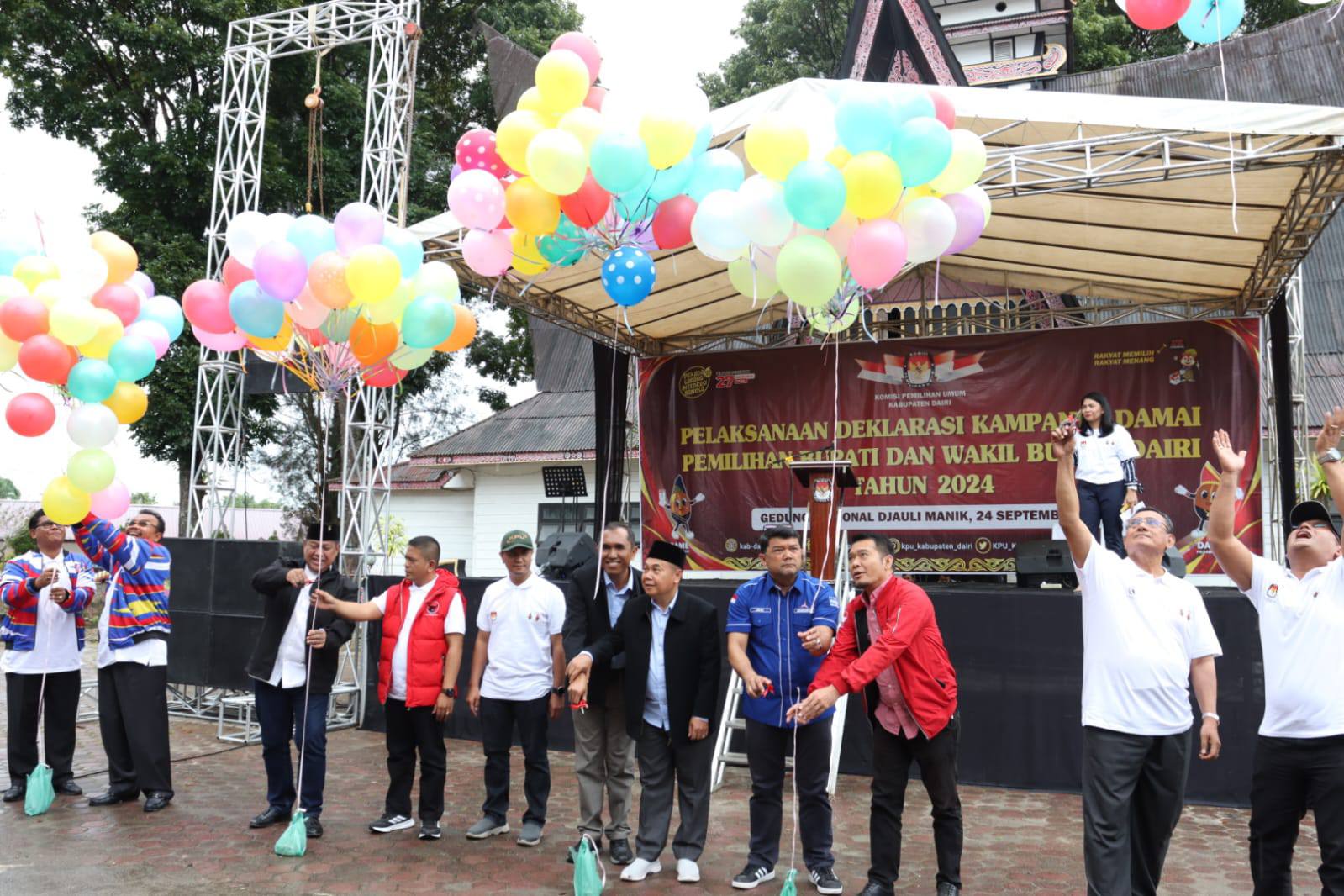 Kampanye damai ditandai dengan penandatanganan dan pelepasan balon ke udara oleh kelima pasangan calon Bupati dan Wakil Bupati. Turut hadir dalam kegiatan tersebut Kapolres Dairi AKBP Agus Bahari Parama Artha serta Ketua Bawaslu Dairi Idrus Maha. (JS)