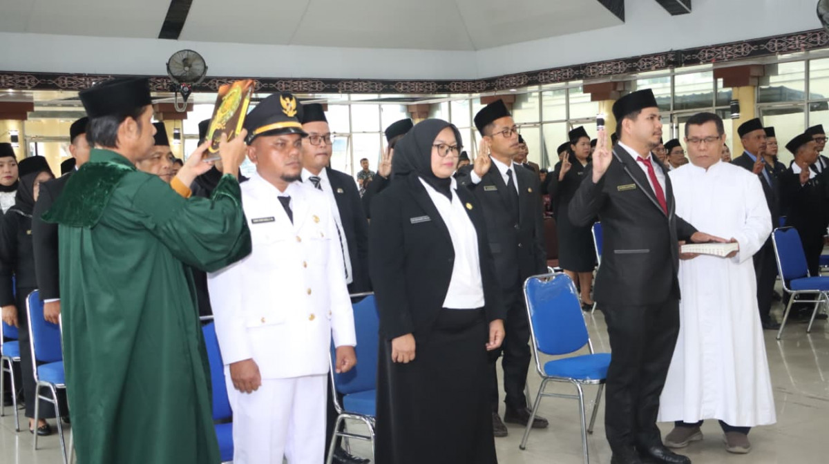 Sidikalang - Bupati Dairi Vickner Sinaga melantik dan mengambil sumpah janji jabatan pejabat di lingkungan Pemerintah Kabupaten Dairi pada Kamis (25/9/2025) di gedung Balai Budaya Sidikalang. Pelantikan dan pengambilan sumpah janji jabatan turut dihadiri oleh Wakil Bupati Dairi Wahyu Daniel Sagala serta Sekretaris Daerah Surung Charles Bantjin.