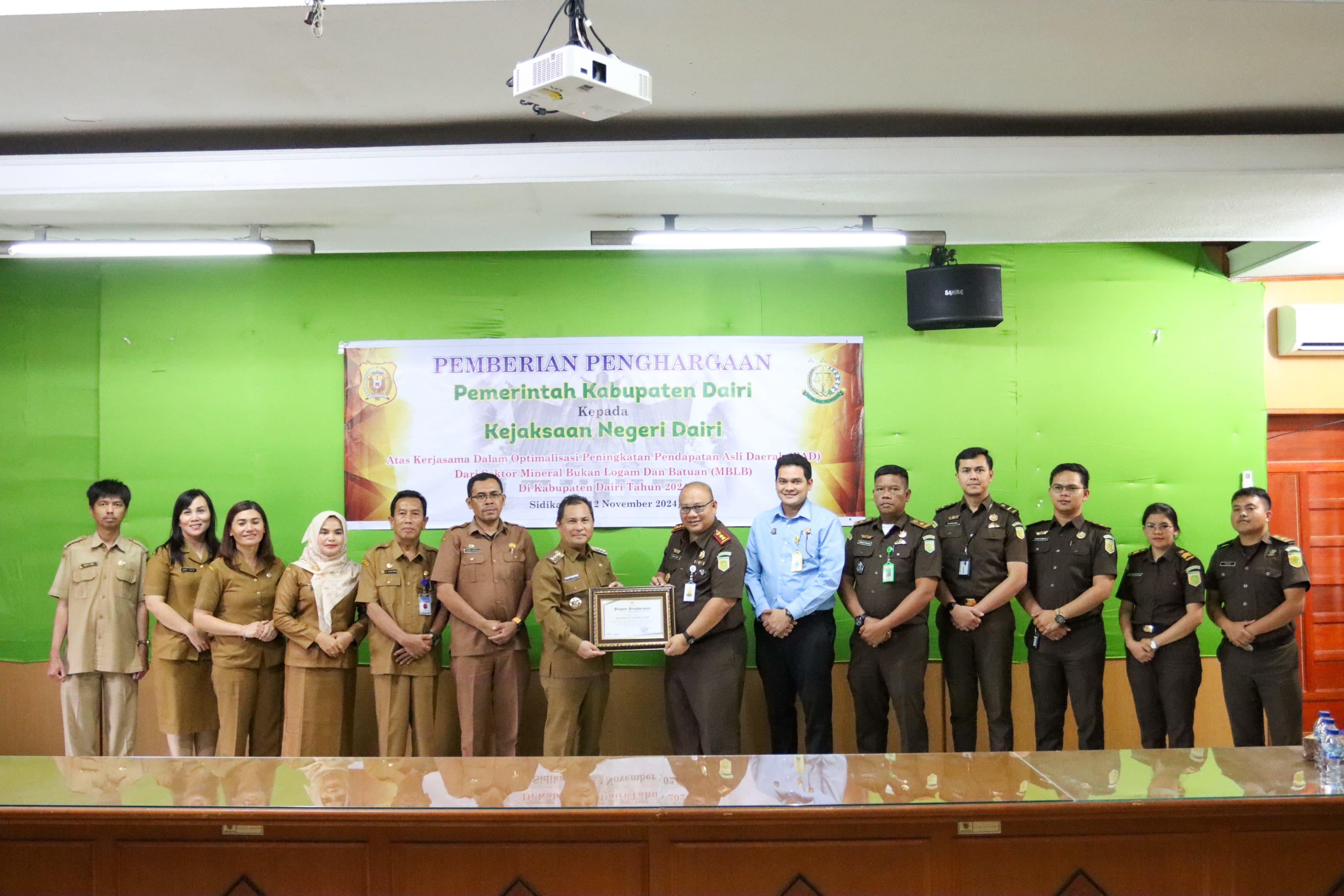 DAIRIKAB.go.id - Pemerintah Kabupaten Dairi dalam hal ini Badan Pendapatan Daerah (Bapenda) Kabupaten Dairi memberikan penghargaan kepada Kejaksaan Negeri Dairi atas kerjasama dalam optimalisasi peningkatan Pendapatan Asli Daerah (PAD) dari sektor Mineral Bukan Logam dan Batuan (MBLB) di Kabupaten Dairi Tahun 2024.