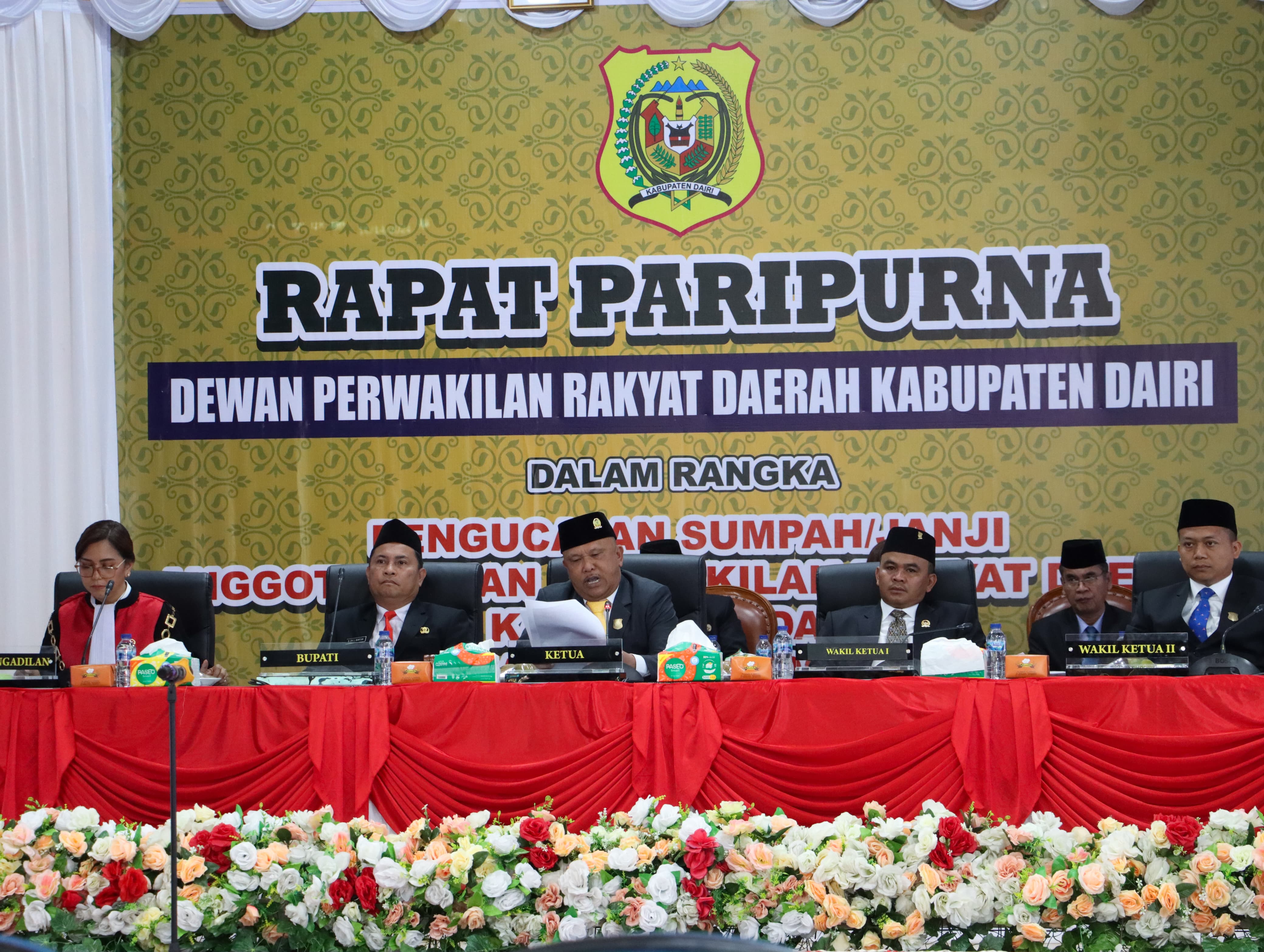 Dilakukan oleh Ketua Pengadilan Negeri Sidikalang Eva Rina Sihombing, S.H., M.H., pengambilan Sumpah/janji anggota DPRD Kabupaten Dairi merupakan tindak lanjut dari Surat Keputusan Gubernur Sumatera Utara Nomor 188.4/646/KPTS/204 tentang pemberhentian Anggota DPRD Kabuapten Dairi masa jabatan 2019-2024 dan Peresmian pengangkatan Anggota DPRD masa jabatan 2024-2029.