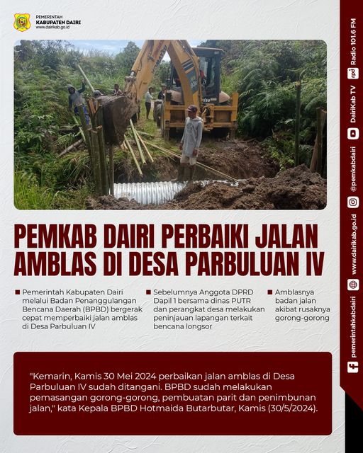 Pemerintah Kabupaten Dairi melalui Badan Penanggulangan Bencana Daerah (BPBD) melakukan perbaikan jalan amblas di Desa Parbuluan IV, Kecamatan Parbuluan, Kamis (30/5/2024).
