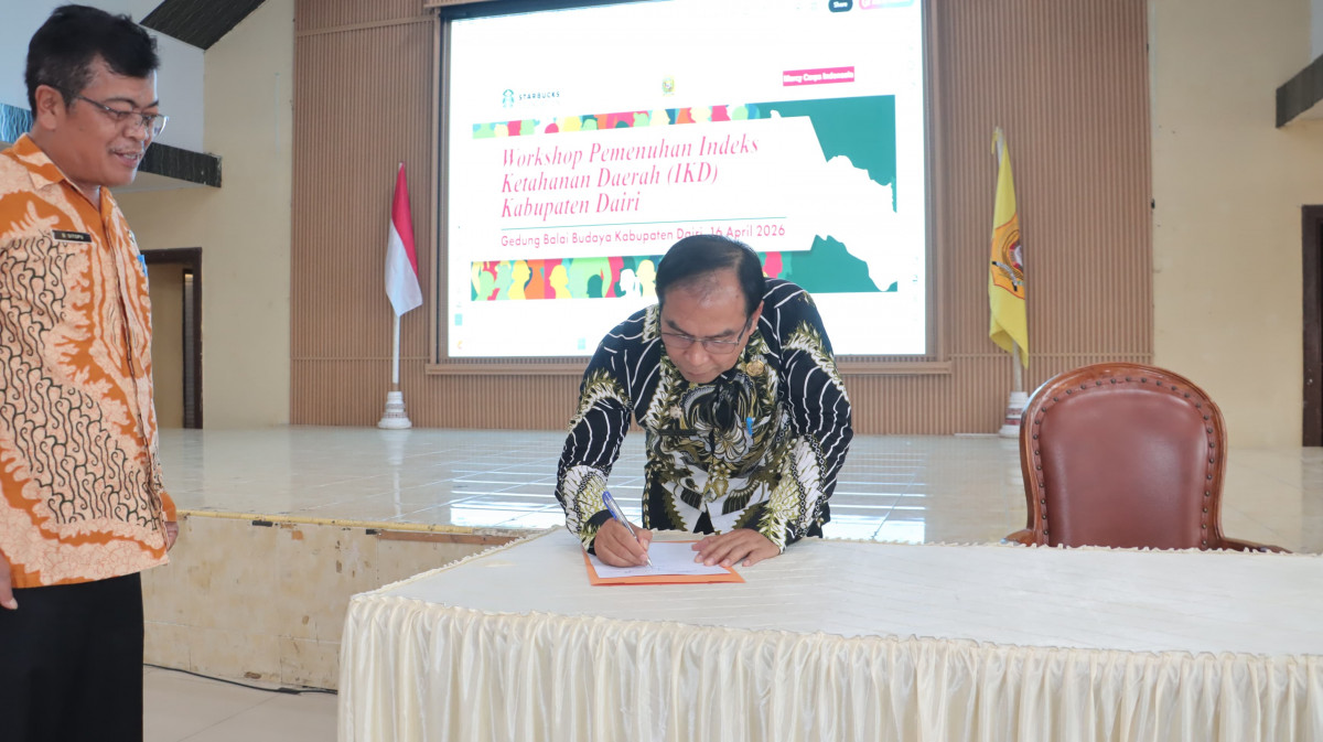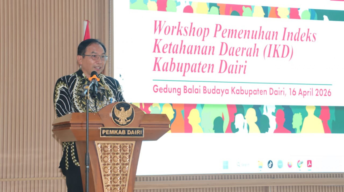 Dairi - Bupati Dairi Vickner Sinaga yang diwakili oleh Asisten Pembangunan dan Perekonomian Junihardi Siregar, menghadiri dan membuka kegiatan workshop pemenuhan Indeks Ketahanan Daerah (IKD) Kabupaten Dairi pada Kamis (16/4/2026) di Balai Budaya Sidikalang. Workshop tersebut diadakan oleh Mercy Corps Indonesia yang bekerjasama dengan Pemkab Dairi dengan menghadirkan narasumber yakni Analis Kebencanaan Ahli Madya Direktorat Pemetaan dan Evaluasi Resiko Bencana Deputi Bidang Sistem dan Strategi BNPB Edy Surawan Purba, Kabid Pencegahan dan Kesiapsiagaan BPBD Provinsi Sumatera Utara MP. Naibaho.