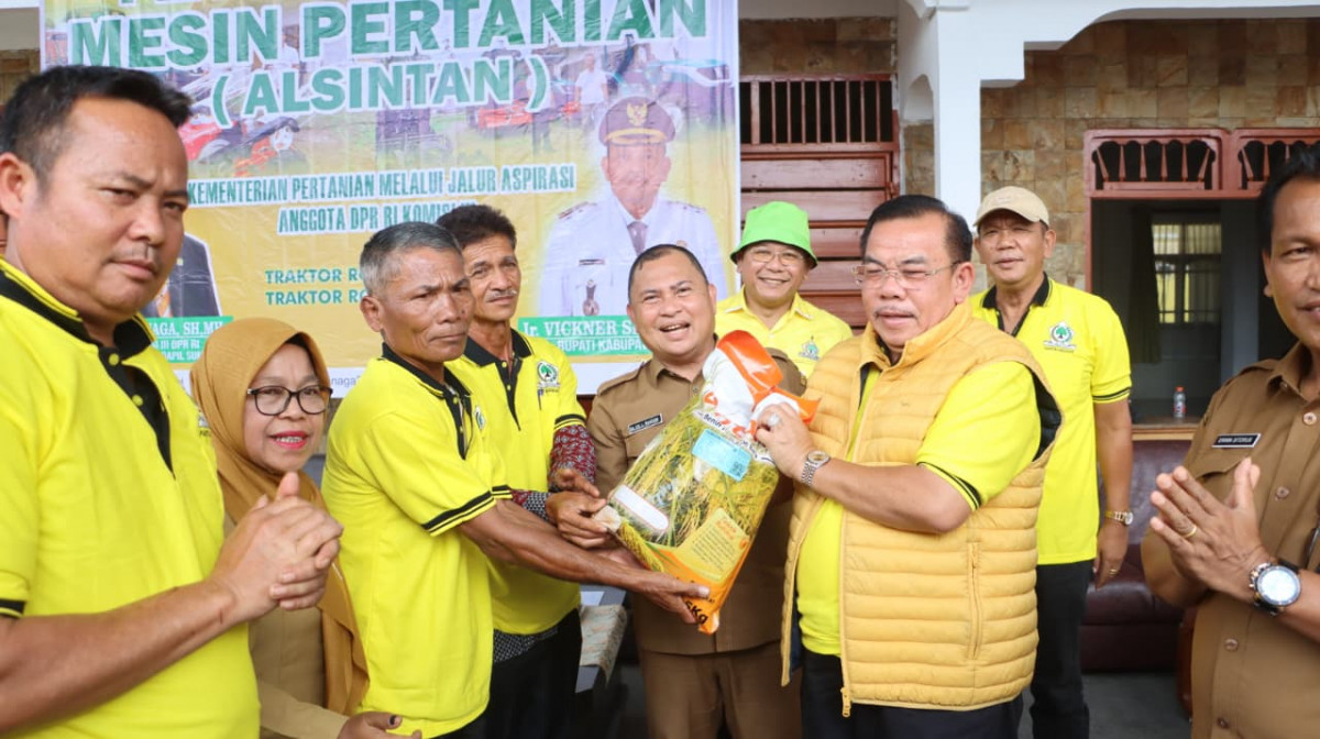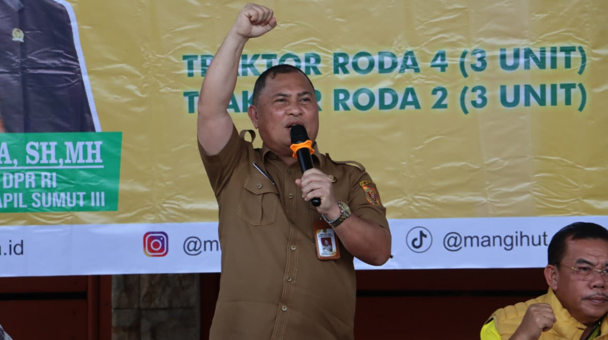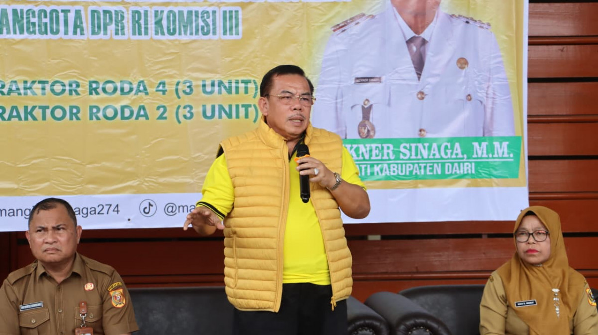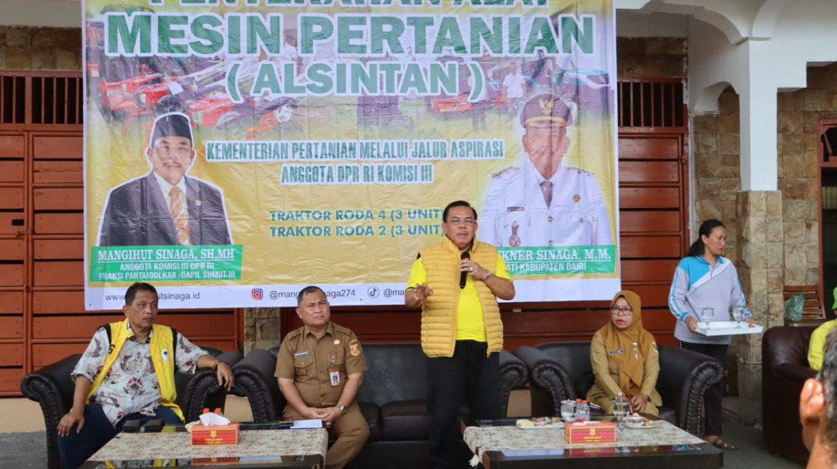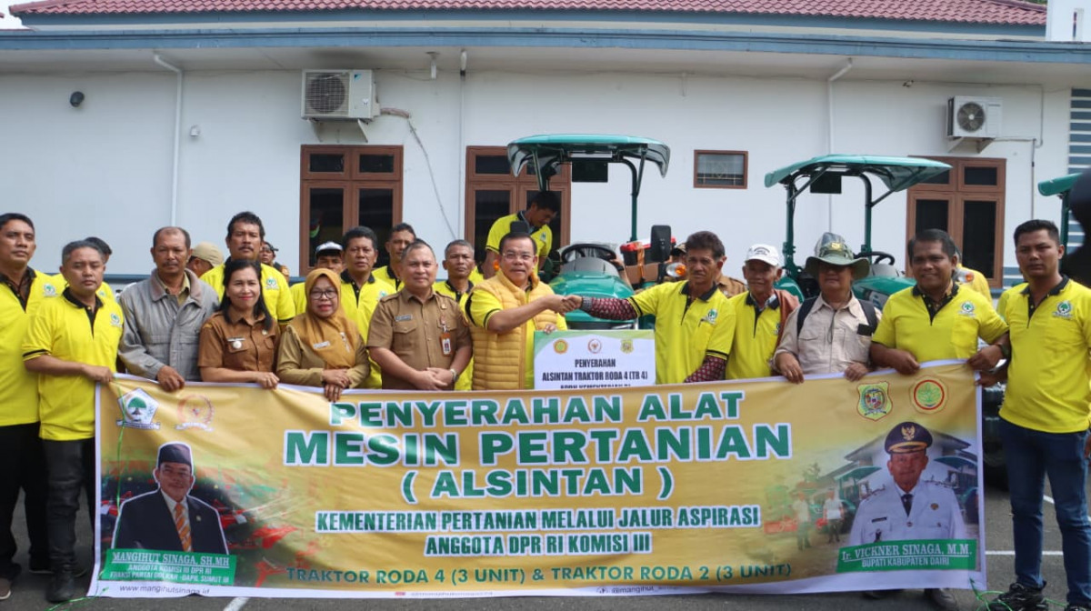 Pemerintah Kabupaten Dairi bersama-sama dengan anggota DPR RI Komisi III, Mangihut Sinaga, SH MH, menyalurkan 6 unit Alat Pertanian (Alsintan) berupa 3 unit traktor roda 4, 3 traktor roda 2 dan benih Padi Gogo, kepada 6 kelompok tani dari 4 Kecamatan yang ada di Dairi. Selasa (28/4/2026) di pelataran Pendopo Bupati Dairi