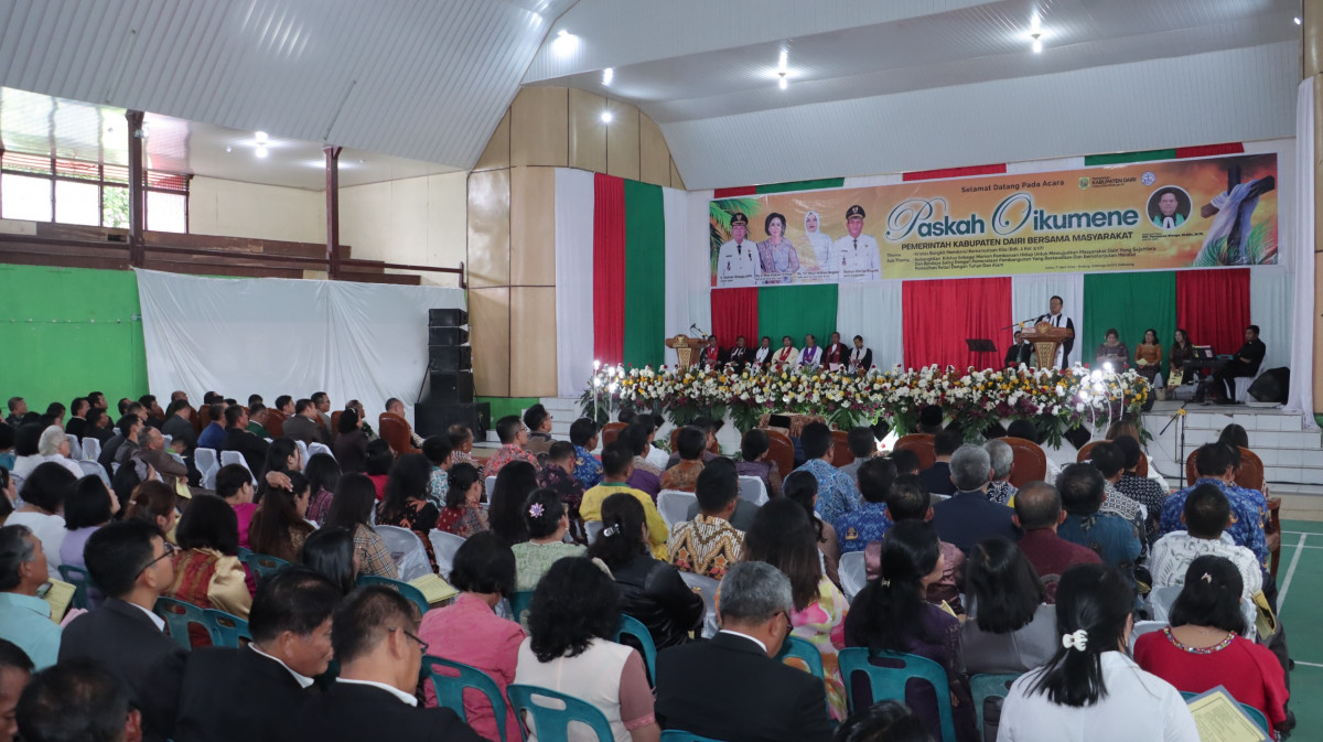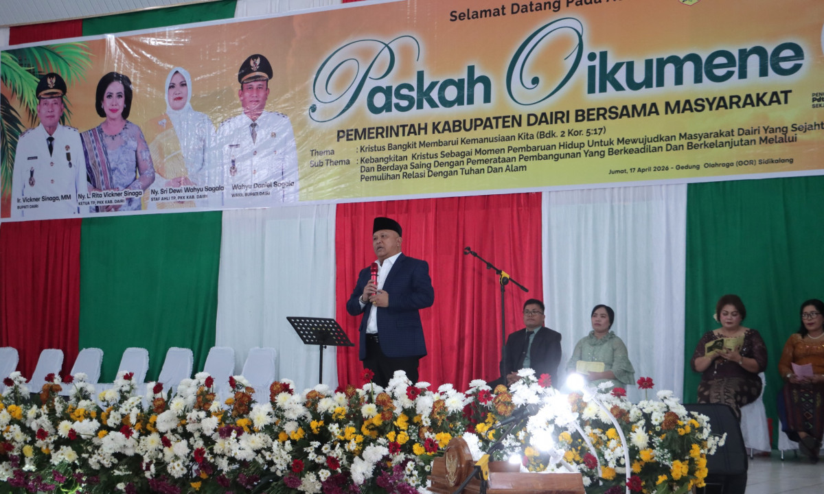 Dairi - Pemkab Dairi rayakan Paskah Oikumene pada Jumat (17/4/2026) di GOR Sidikalang. Perayaan Paskah Oikumene di hadiri oleh Bupati Dairi Vickner Sinaga, Wakil Bupati Dairi Wahyu Daniel Sagala, Unsur Forkopimda Dairi, Ketua Tim Penggerak PKK Dairi Rita Puspita Vickner Sinaga, Tokoh Agama dan Tokoh Masyarakat, serta jajaran ASN Pemkab Dairi.