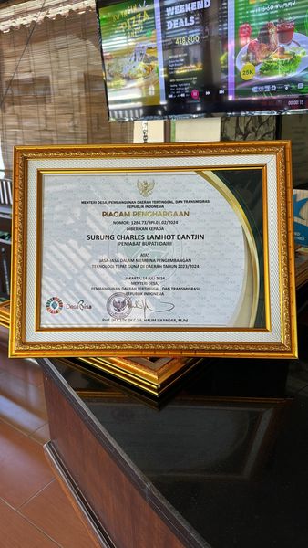 DAIRIKAB.go.id - Penjabat (Pj) Bupati Dairi, Surung Charles Lamhot Bantjin menerima piagam penghargaan Atas "Jasa-jasa Dalam Membina Pengembangan Teknologi Tepat Guna di Daerah Tahun 2023/2024.