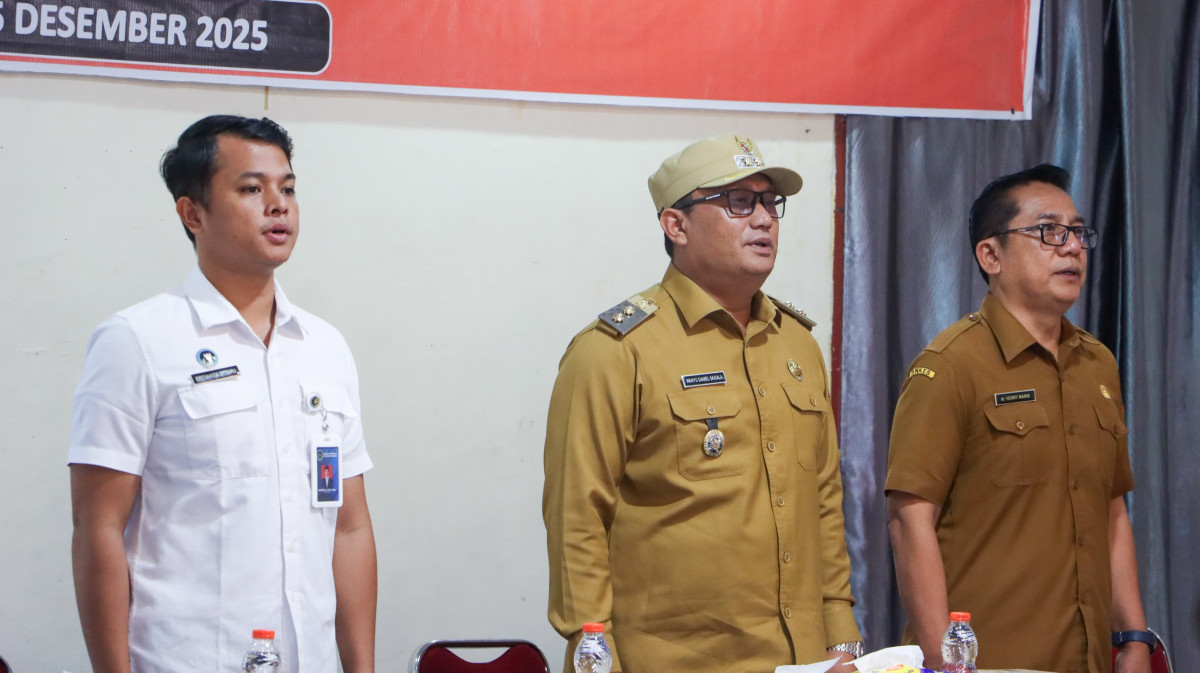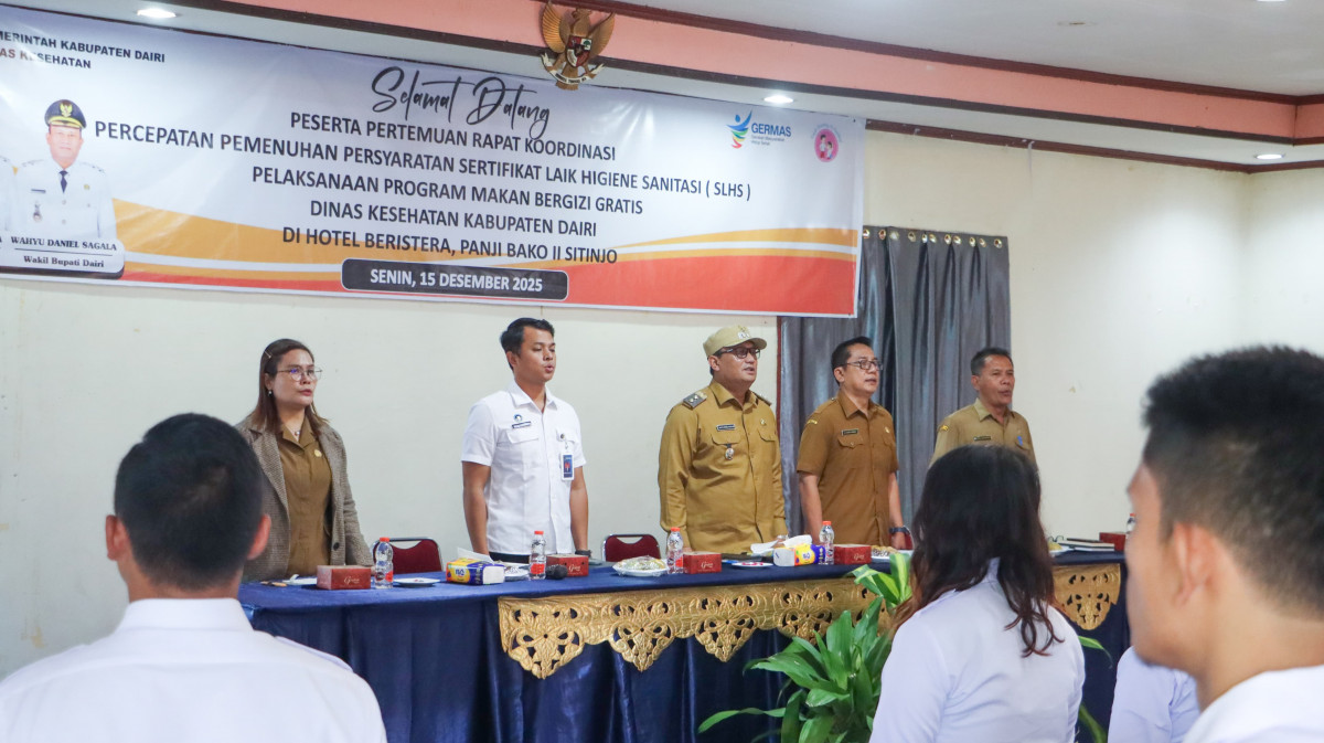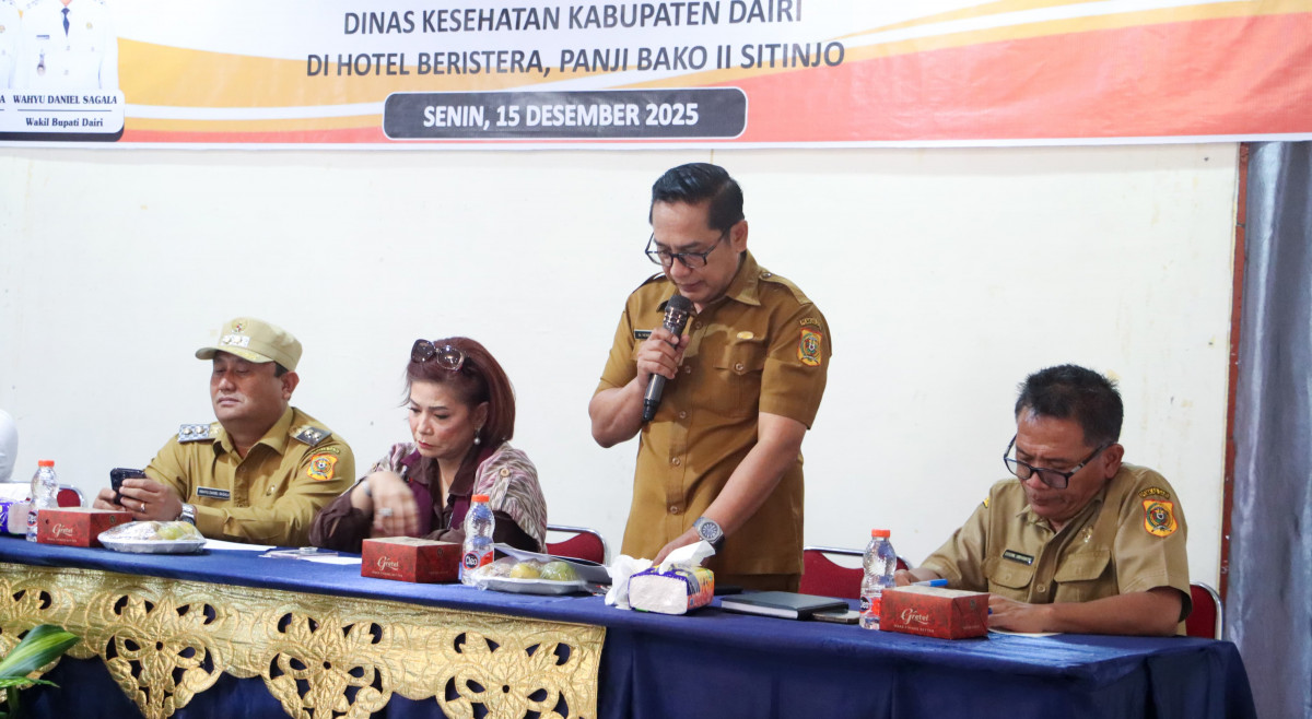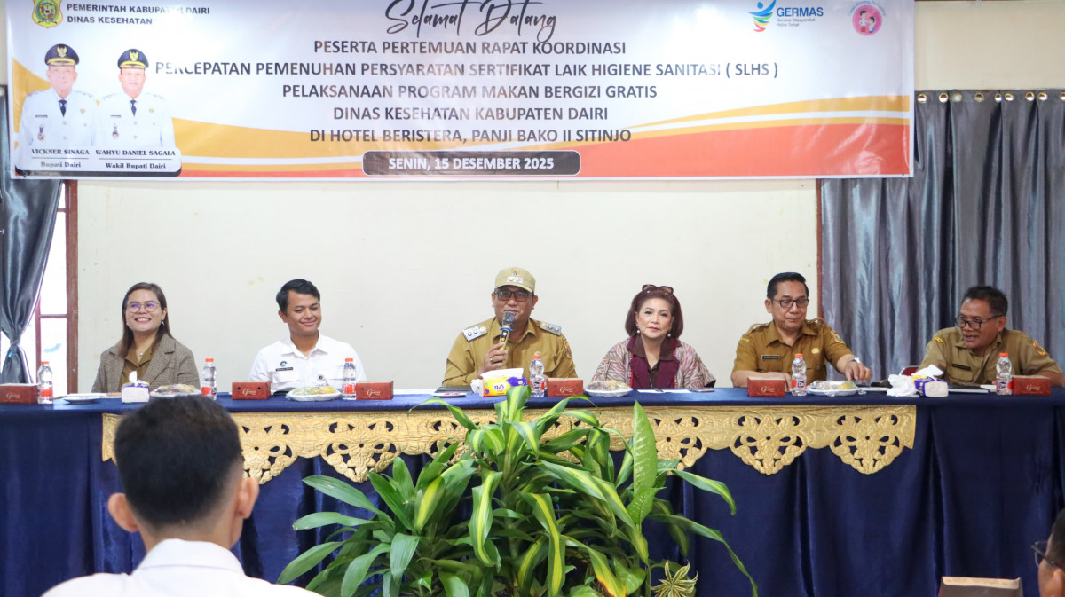 Sitinjo - Wakil Bupati Dairi Wahyu Daniel Sagala memimpin rapat koordinasi (Rakor) percepatan pemenuhan persyaratan sertifikat laik higiene sanitasi (SLHS) pelaksanaan program makan bergizi gratis (MBG), Senin (15/12/2025) di Hotel Beristera Sitinjo. Turut hadir mendampingi Wakil Bupati Dairi, Staf Ahli Bidang Kemasyarakatan, Sumber Daya Manusia dan Pelayanan Umum Ruspal Simarmata.