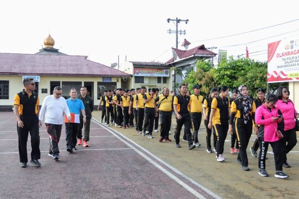 DAIRIKAB.go.id – Menyambut HUT Bhayangkara ke-78, Polres Dairi mengadakan kegiatan olahraga bersama TNI dan Forkopimda pada Sabtu 29 Juni 2024 di Lapangan Apel Polres Dairi. Olahraga bersama yang diadakan oleh Polres Dairi yakni jalan santai dan senam bersama diikuti oleh Pj Bupati Dairi Surung Charles Bantjin, Kapolres Dairi AKBP Agus Bahari Parama Artha, Dandim 0206 Dairi Letkol Inf Goklas Pirtahan Silaban serta Kepala Kejaksaan Negeri Dairi Okto Ricardo.