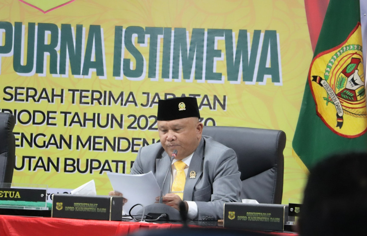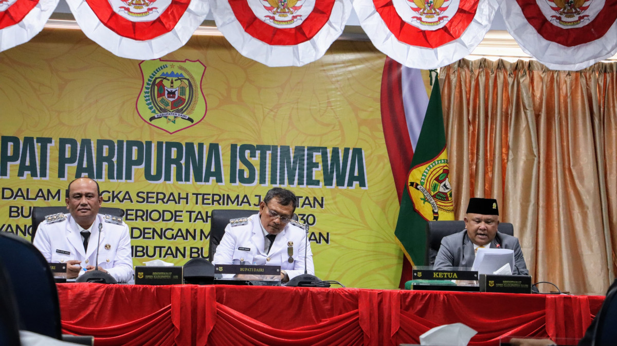 Dairi - Dewan Perwakilan Daerah (DPRD) Dairi mengadakan Rapat Paripurna Istimewa dengan agenda serah terima jabatan Bupati Dairi periode 2025-2030 pada Senin (3/3/2025) di Gedung DPRD. Rapat paripurna yang dirangkai dengan mendengarkan Pidato Perdana Bupati Dairi dipimpin oleh Ketua DPRD Dairi Sabam Sibarani di dampingi oleh Wakil Ketua DPRD Dairi yakni Halvensius Tondang dan Wanseptember Situmorang.
