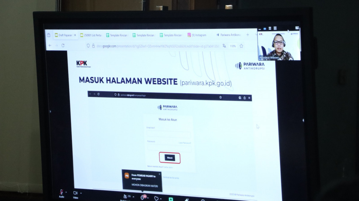 Sidikalang - Sekretaris Daerah Surung Charles Bantjin mengikuti Sosialisasi Teknis Pendaftaran dan Pelaporan Kampanye Pariwara Antikorupsi 2025 melalui zoom meeting yang dilakukan oleh Komisi Pemberantasan Korupsi (KPK) pada Senin (1/9/2025). Sosialisasi teknis tersebut dibuka oleh Direktur Sosialisasi dan Kampanye Antikorupsi KPK Amir Arief.