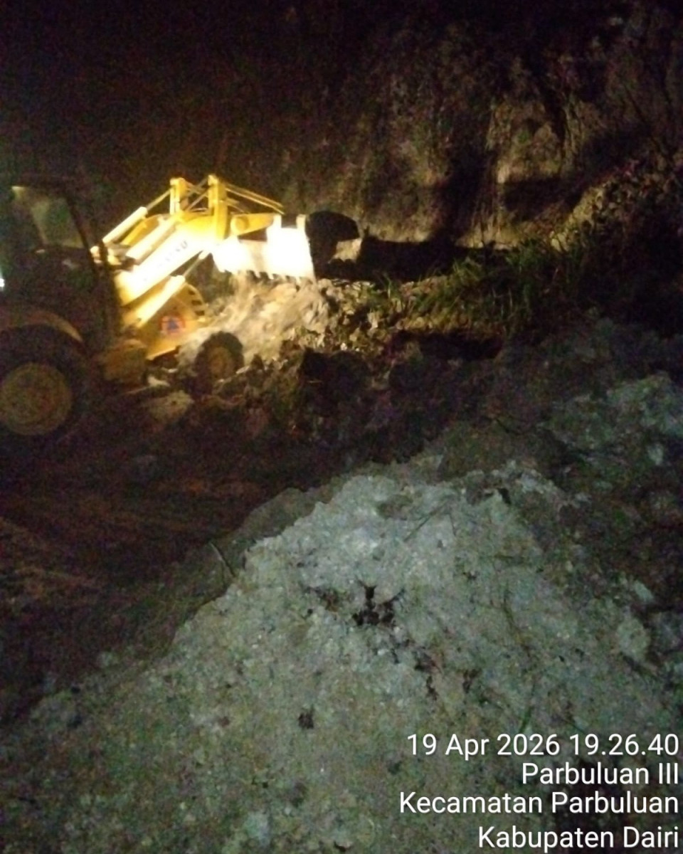 DAIRI - Tingginya curah hujan akhir-akhir ini telah mengakibatkan longsor di jalur vital lintas Sumatera kembali menguji kesiapsiagaan aparat dan masyarakat. Akses jalan lintas nasional menuju Tele, tepatnya di Pangiringan, Desa Parbuluan V, Kecamatan Parbuluan, Kabupaten Dairi, sempat lumpuh total akibat material tanah yang menutup badan jalan pada Minggu, (19/4/2026).