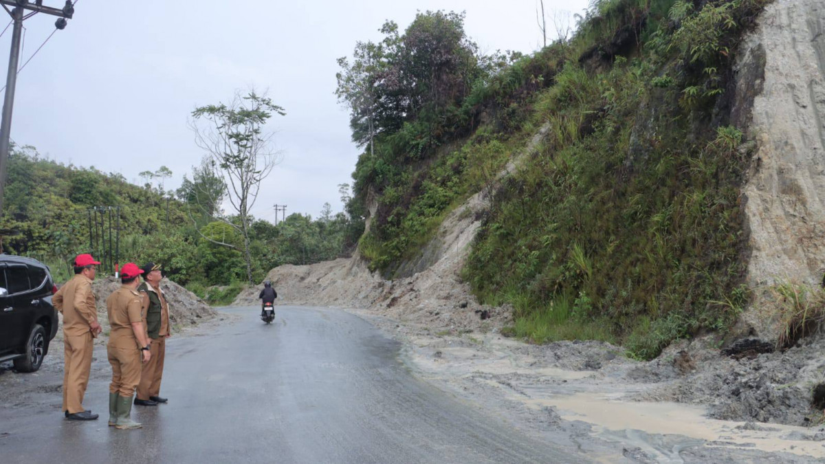 Jalan Lintas Sumatera (Jalinsum) akses Sidikalang–Samosir–Dolok Sanggul, tepatnya di Desa Parbuluan V, Kecamatan Parbuluan, Kabupaten Dairi, Senin (20/4/2026). Seperti diketahui, longsor di kawasan tersebut terjadi pada Minggu (19/4/2026) tepatnya di kilometer 26 Desa Parbuluan V sekitar pukul 17.30 wib.