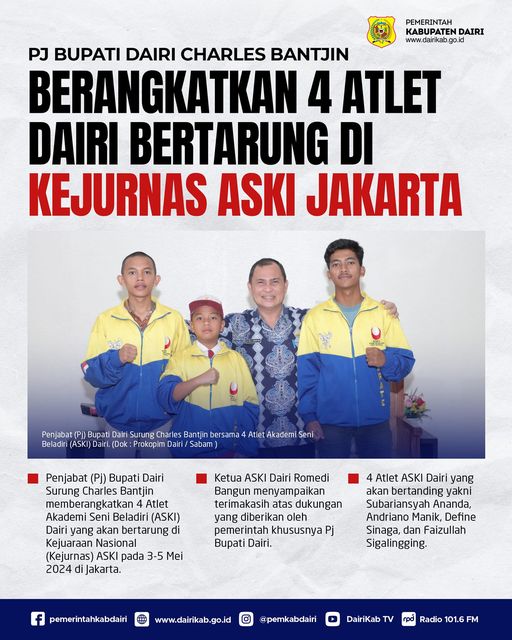 Penjabat (Pj) Bupati Dairi Charles Bantjin memberangkatkan 4 Atlet Akademi Seni Beladiri (ASKI) Dairi yang akan bertarung di Kejuaraan Nasional (Kejurnas) ASKI di Jakarta